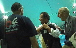 Wasserballexperten im Gespräch: Bernhard Baier (87) DSV-Ehrenpräsident und Silbermedailliengewinner in Berlin 1936, Bernd Seidensticker und Peter Röhle